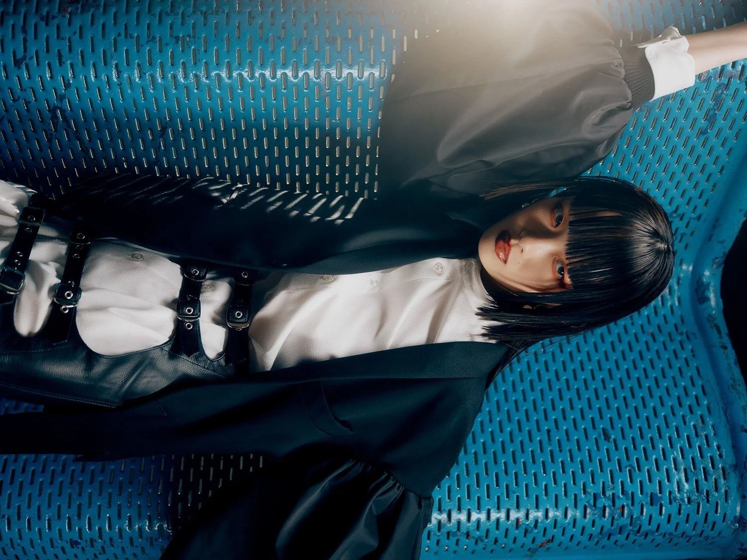 A woman with black hair and bangs lying on a blue perforated surface, wearing a white blouse, black jacket, and black harness with multiple straps.