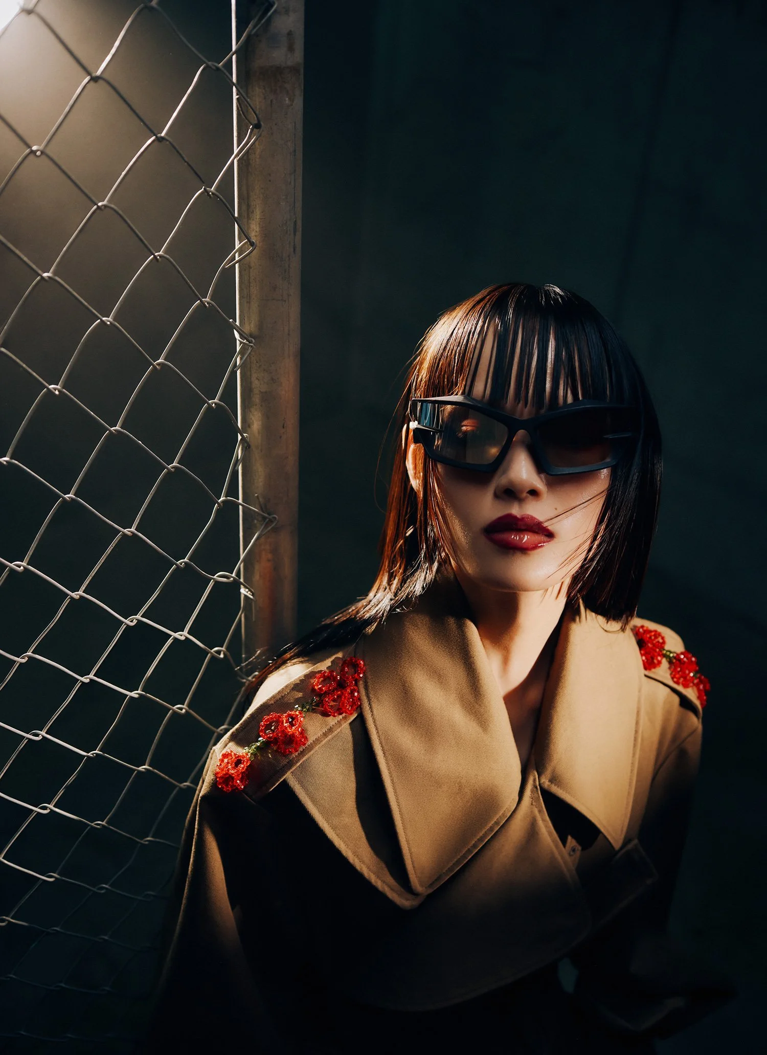 A woman with shoulder-length dark hair wearing large sunglasses and a tan jacket with red floral embroidery on the shoulders, leaning against a chain-link fence in a dimly lit setting.