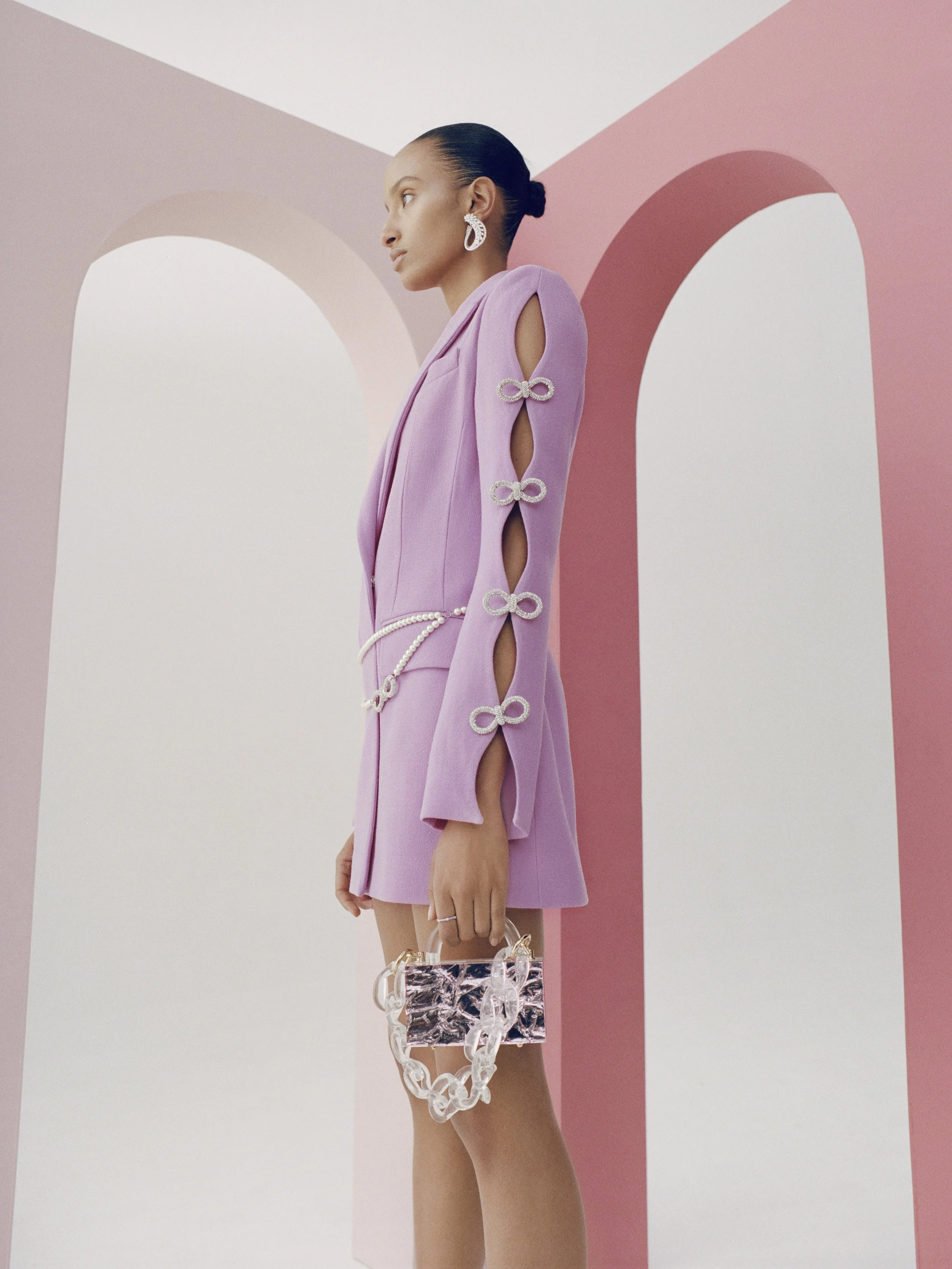 A woman in a lavender blazer dress with cutout sleeves adorned with bows, holding a transparent handbag with a chain handle, standing against a pastel pink and white backdrop.