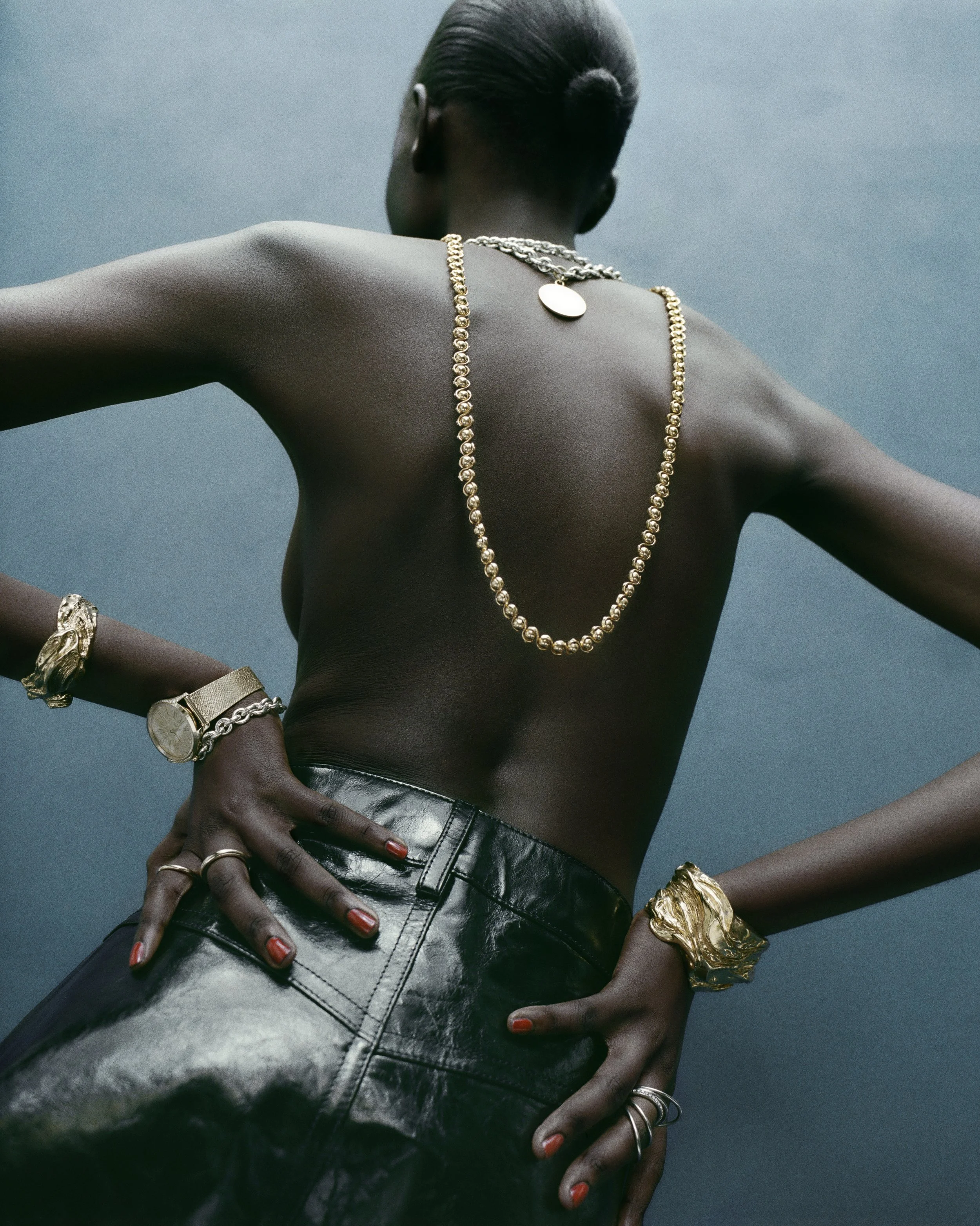 A person with dark skin and a short hairstyle, wearing multiple gold and silver jewelry pieces, including necklaces, bracelets, and rings, with no shirt, black leather pants, and bright red nail polish, posing against a plain dark background.