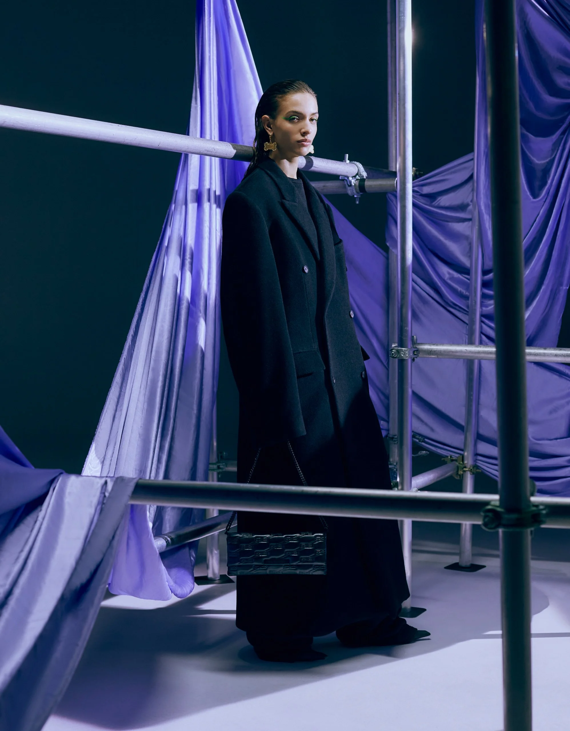 Woman in black coat holding a black handbag, standing among purple drapes and metal scaffolding.