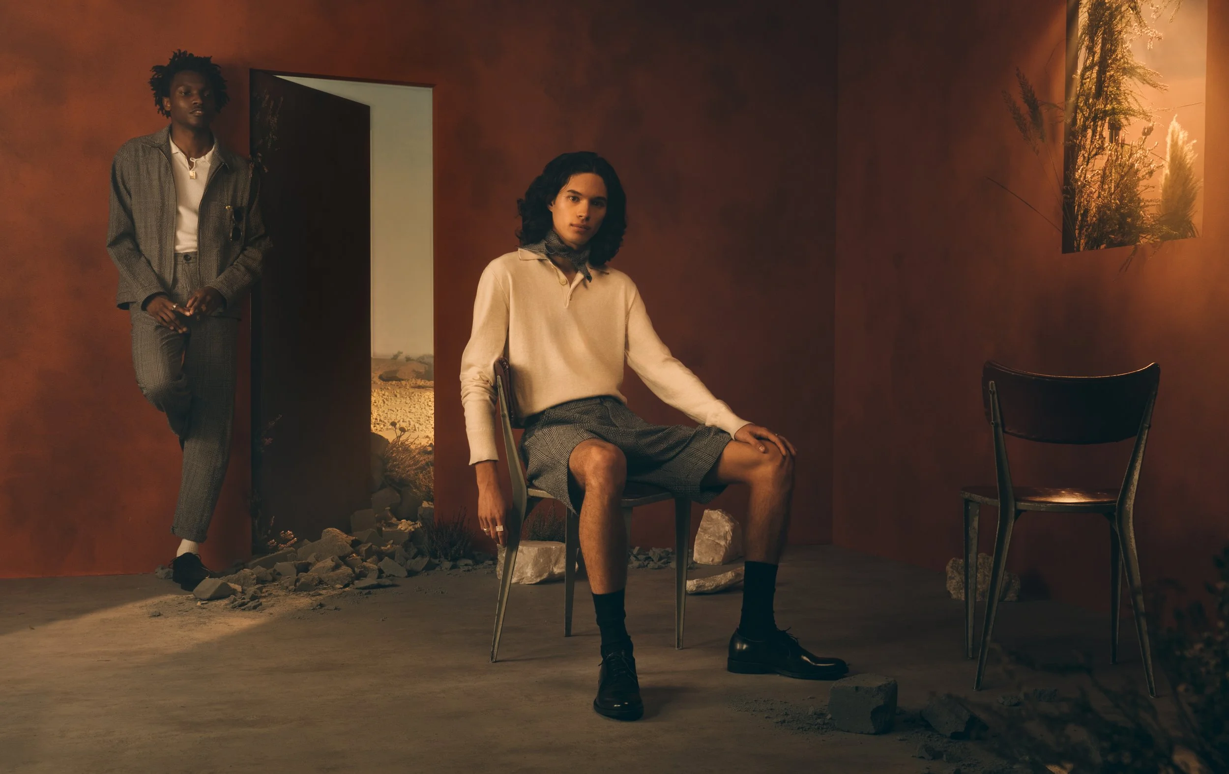 Two young men in vintage-inspired clothing inside an artful room with earthy tones. One is seated on a chair, the other stands near a doorway leading to a desert landscape window.