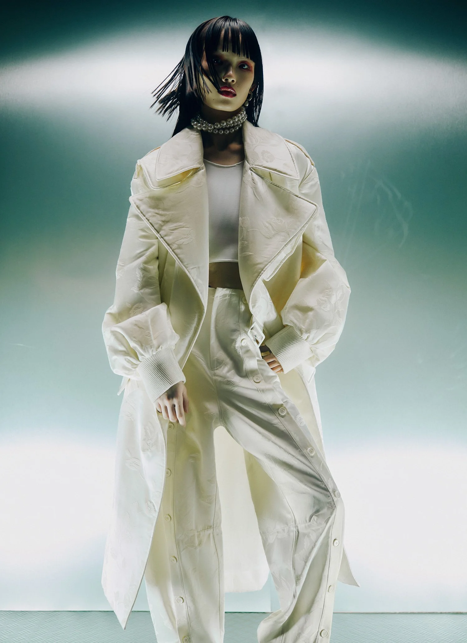A person wearing a white oversized jacket and matching pants, layered over a white crop top, accessorized with a pearl choker and earrings, standing in front of a gradient background.