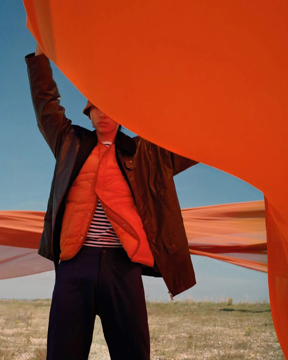A person dressed in a beige blazer, black pants, and a wide-brimmed hat stands barefoot next to a floating red plastic bag against a plain background.