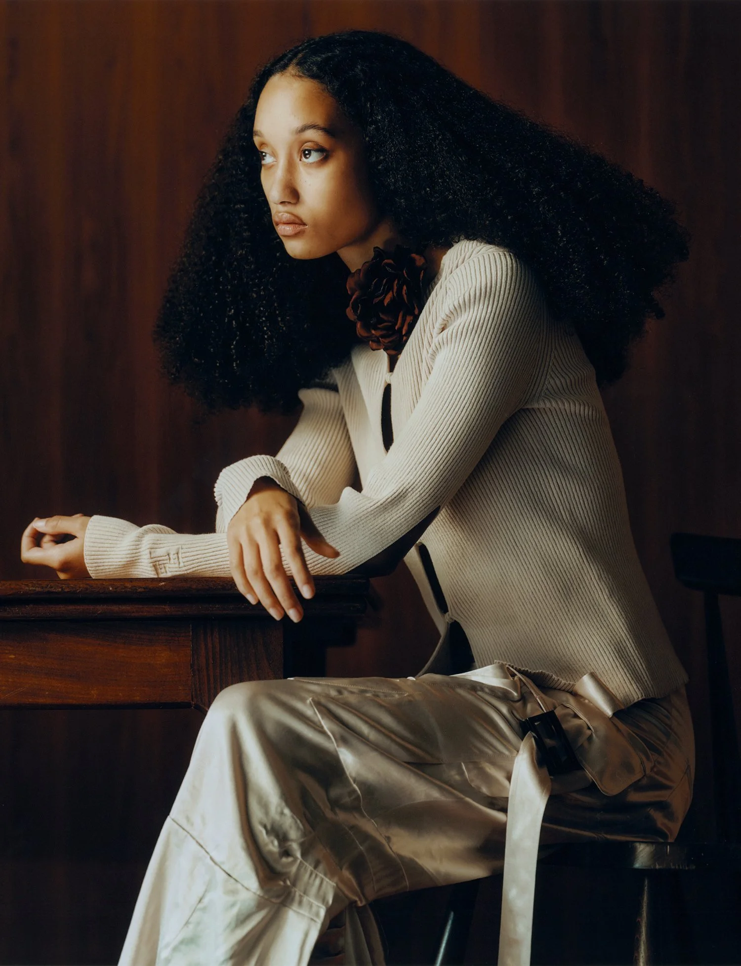 A young woman with curly dark hair sitting at a wooden table, looking pensively to the side, wearing a cream-colored cardigan, shiny beige pants, and a dark patterned neck scarf.
