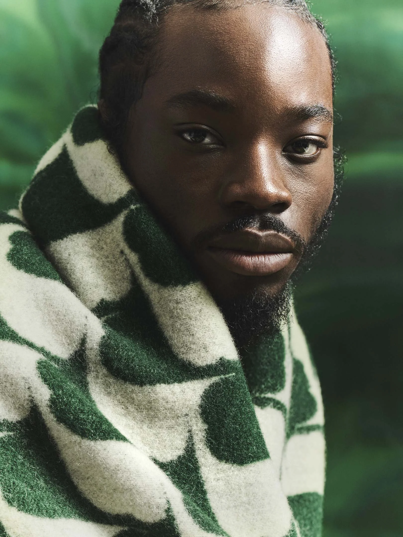 Close-up portrait of a young Black man with a short beard, wearing a patterned green and white scarf, against a green background.
