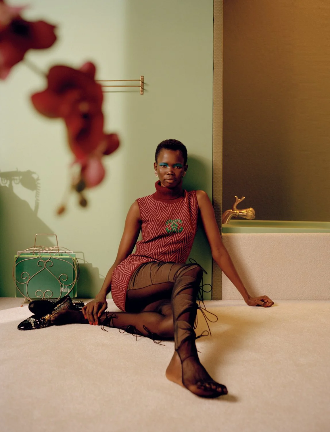 A woman with short hair wearing a red patterned sleeveless dress, black sheer tights with lace-up detail, and black shoes, sitting on the floor against a green and brown wall with a decorative gold whale sculpture and a small table nearby.