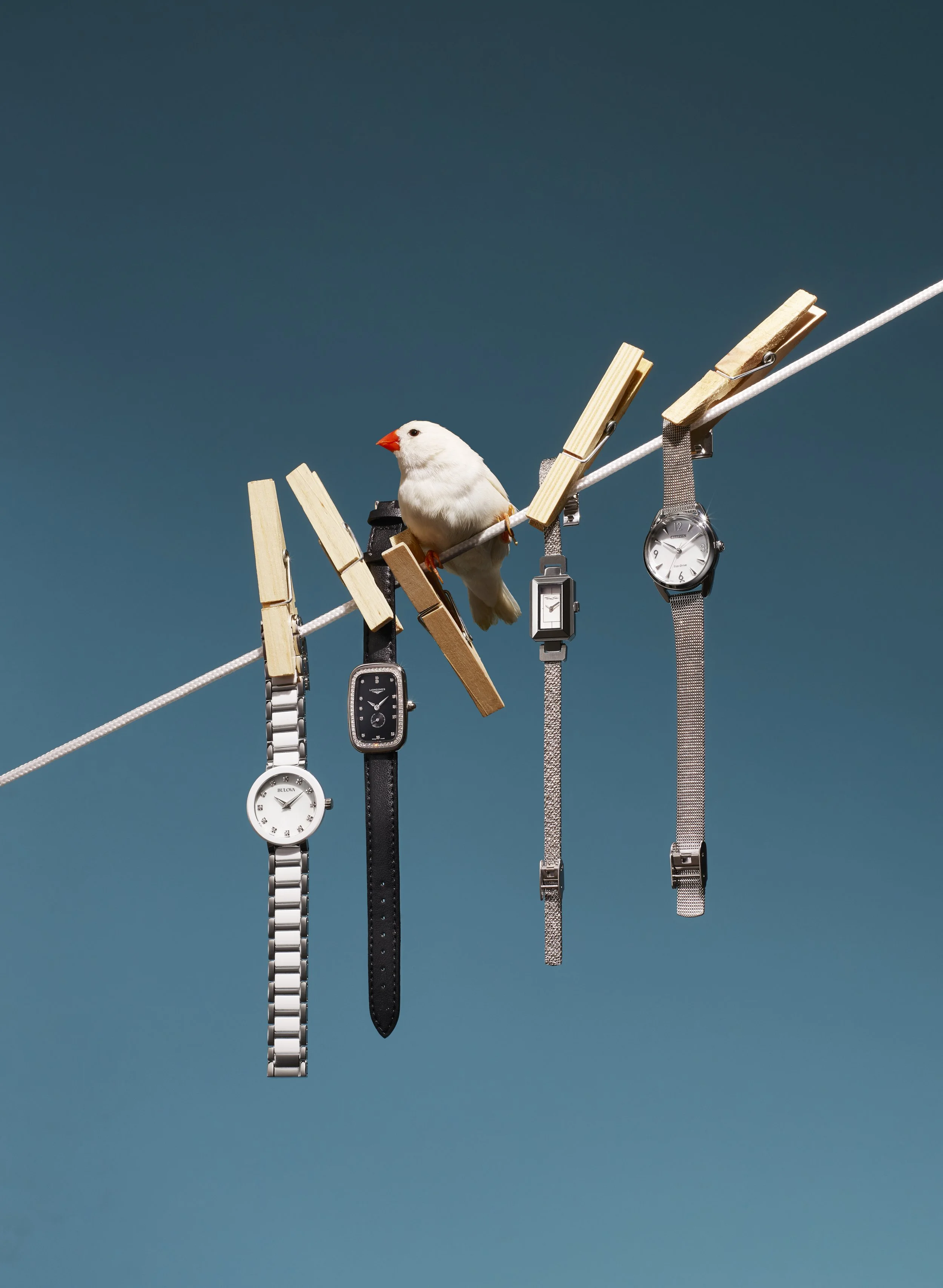 A small white bird perched on a clothesline with four different wristwatches hanging beside it, secured by clothespins against a solid blue background.