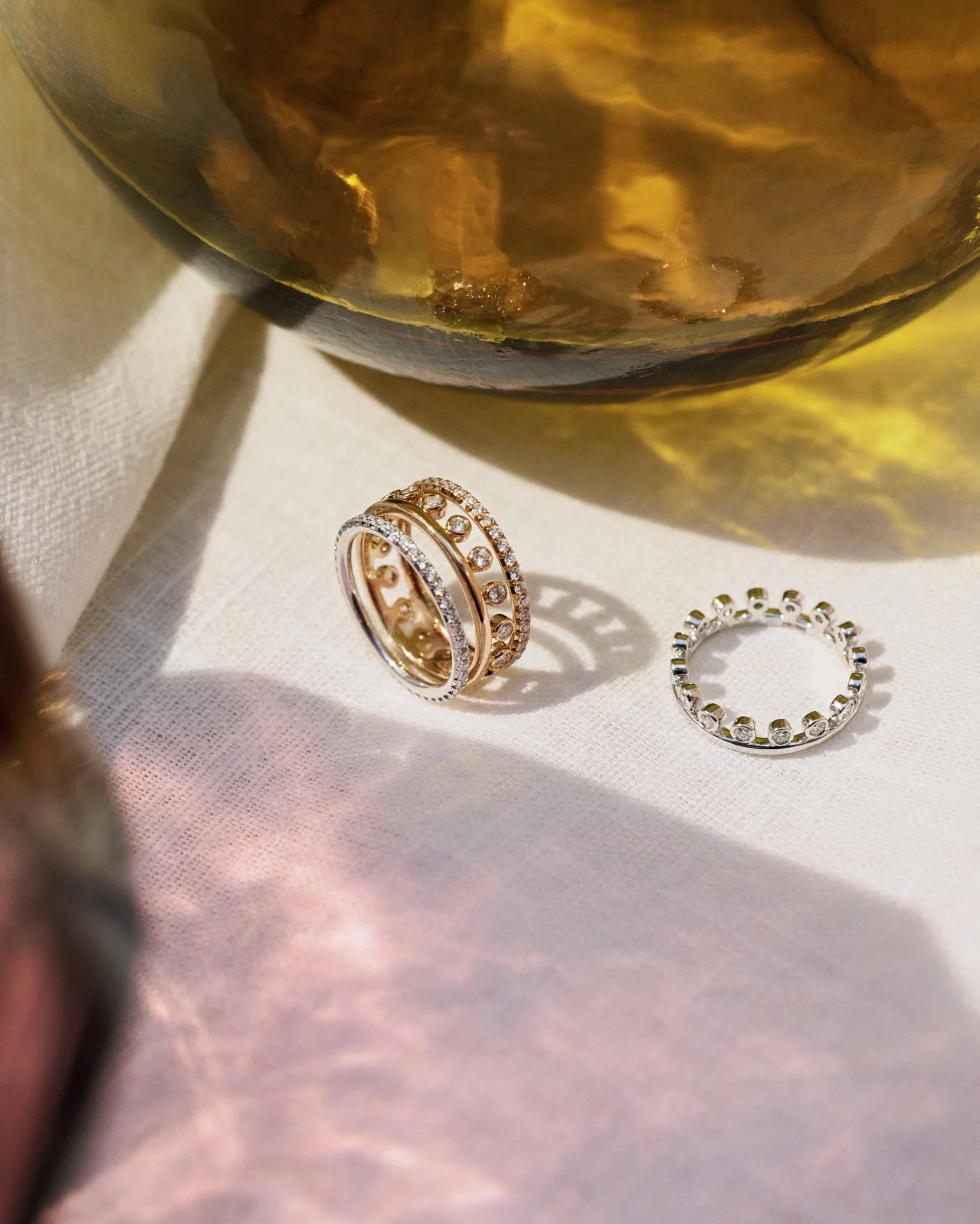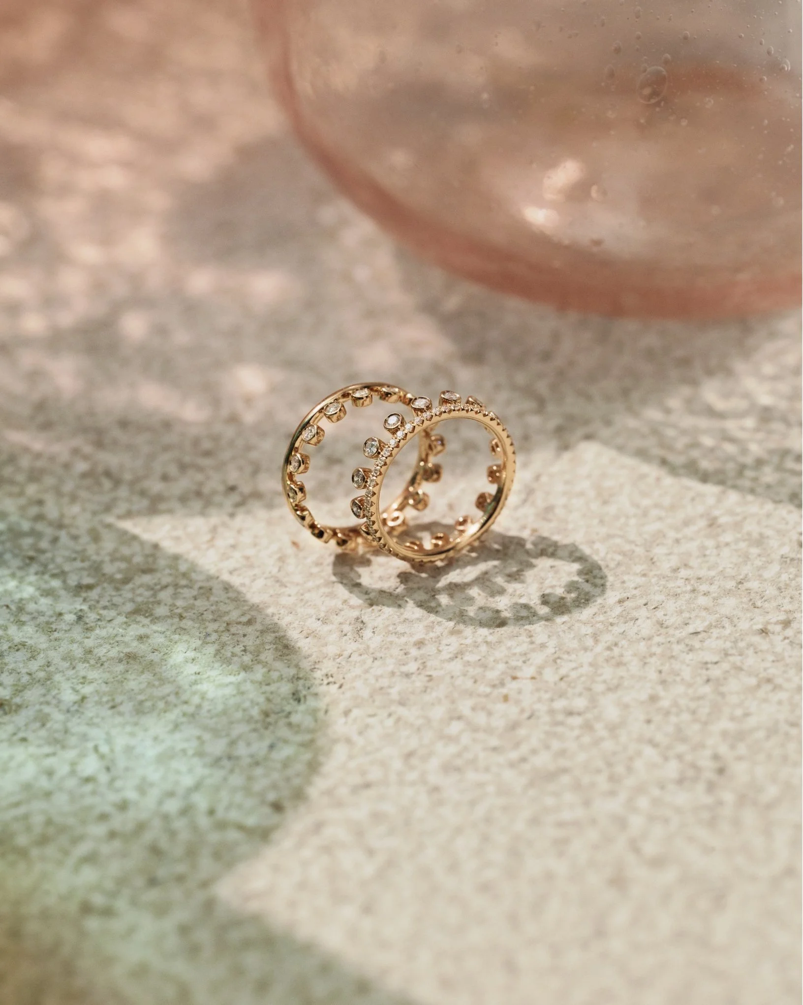 Pair of rose gold rings with small diamonds, placed on a textured surface with a pink glass object in the background.