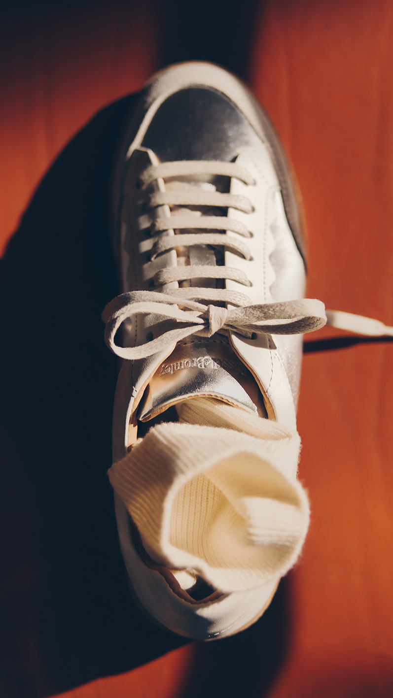 White sneaker with silver accents and white laces, paired with cream-colored socks, on a wooden surface.