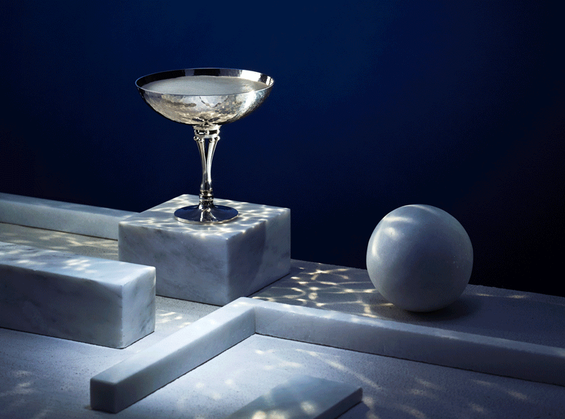 A silver cocktail glass on a marble cube, with a spherical marble object nearby, set against a dark background with light reflections.