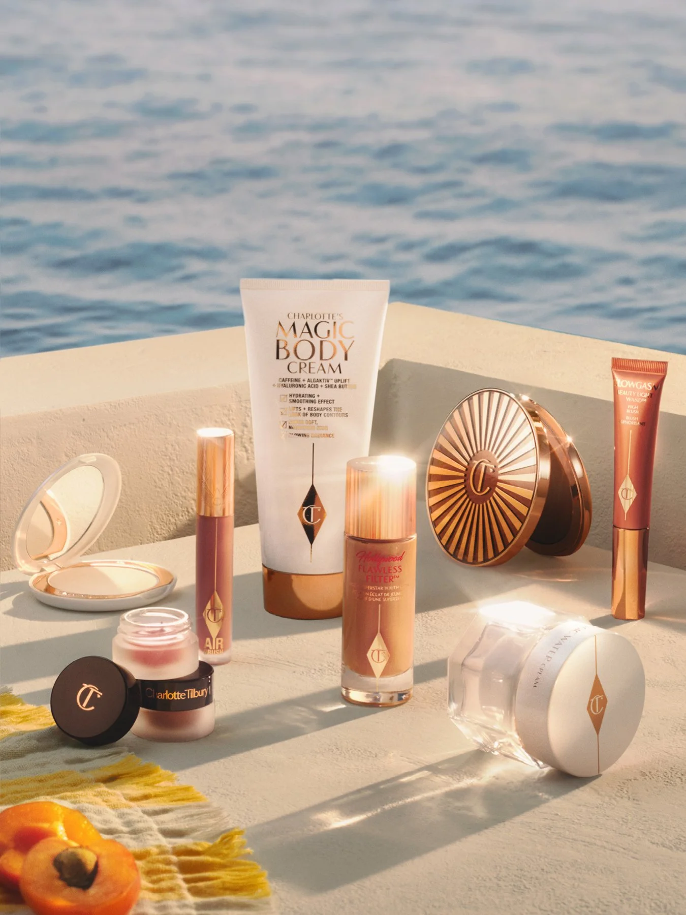 A collection of Charlotte Tilbury makeup products arranged outdoors on a white surface, with the ocean in the background. Items include creams, lip gloss, highlighters, a compact mirror, and a blush, all in rose gold and white packaging.