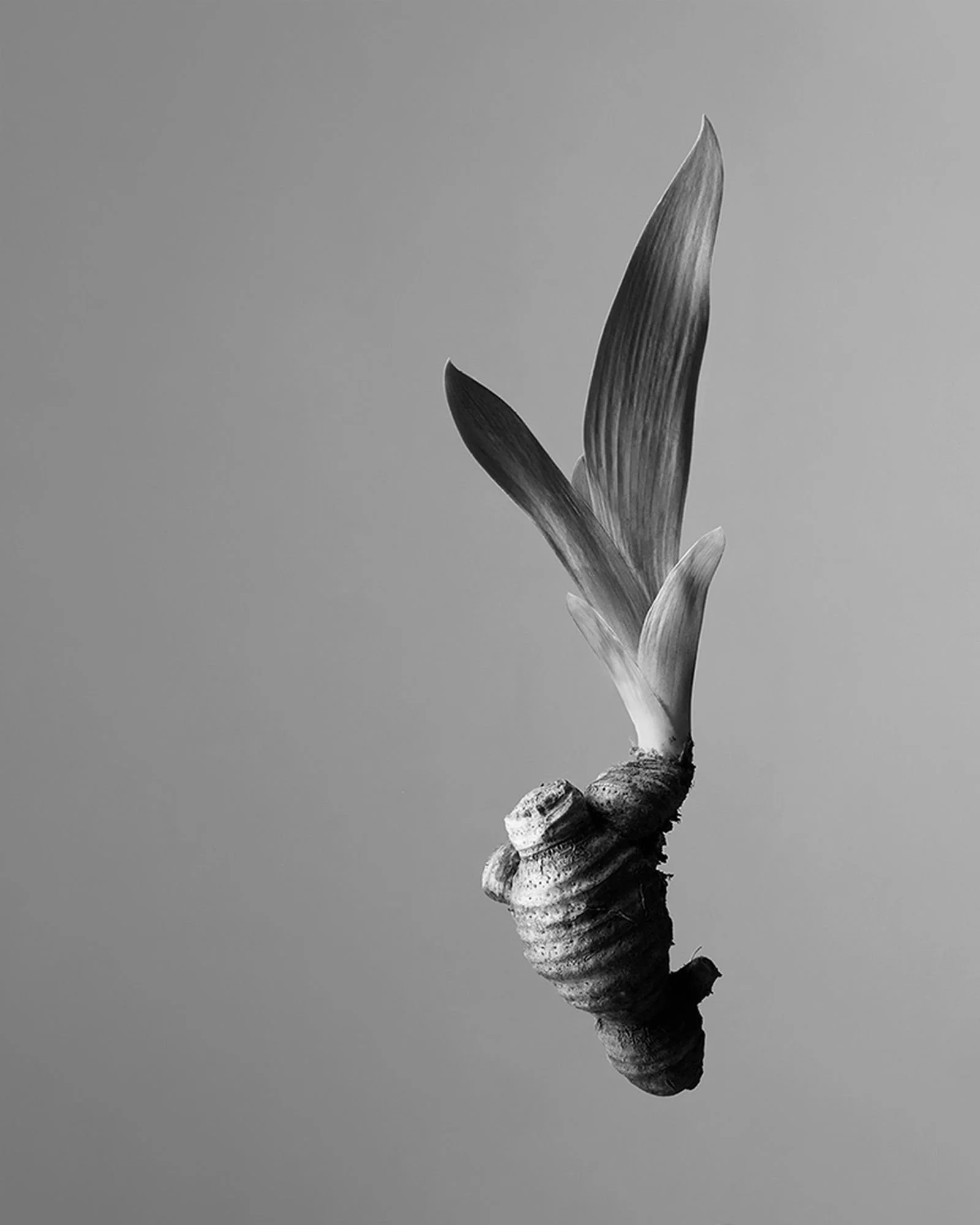 Black and white photograph of a plant with broad leaves growing from a large root or bulb.