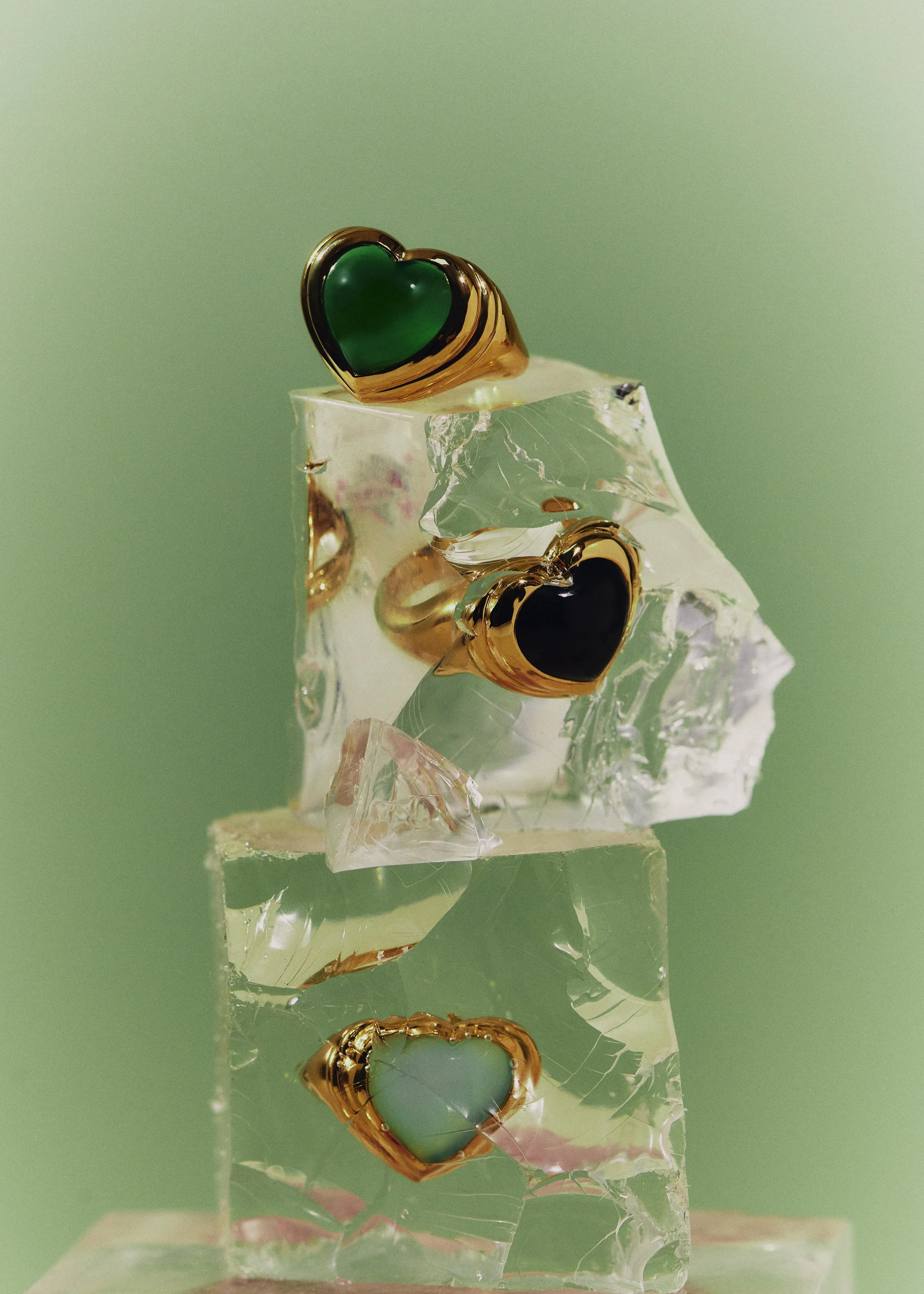 Three rings with heart-shaped stones, two green and one black, displayed on broken glass pieces with a green background.