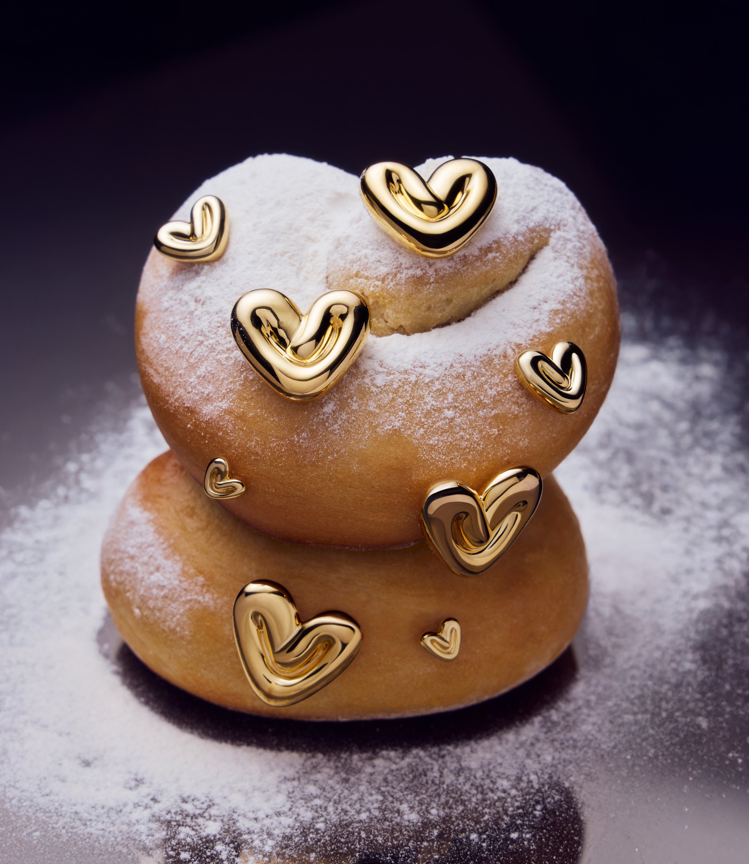 Two stacked vanilla donuts topped with powdered sugar and golden heart-shaped decorations, on a dark surface with powdered sugar scattered around.