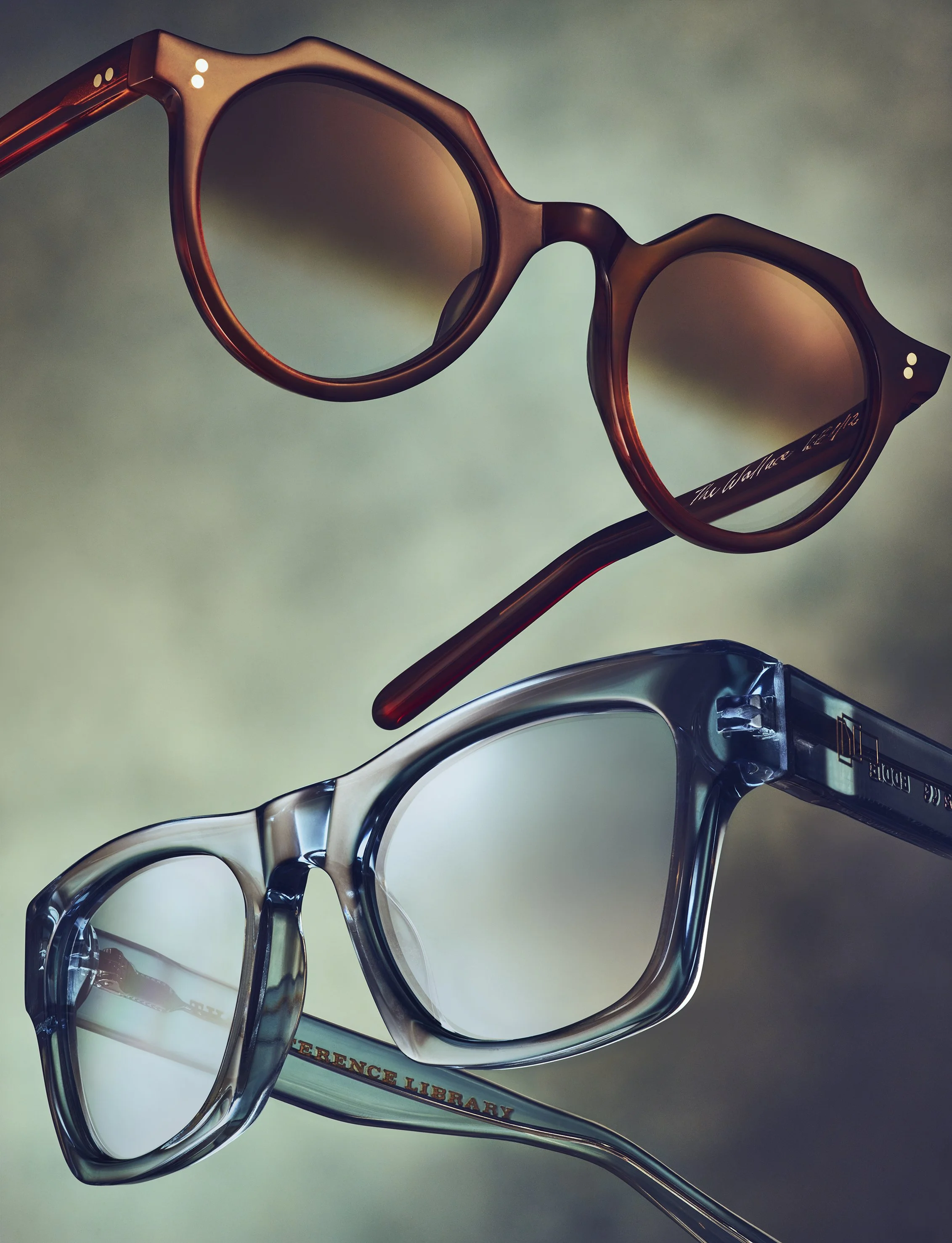 Close-up of two pairs of eyeglasses, one with brown frames and tinted lenses, and the other with clear frames and transparent lenses, against a soft, blurred background.